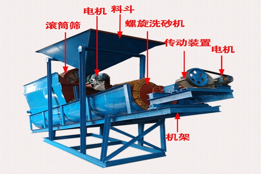 洗沙的作用。这种螺旋筛沙洗沙一体机,砂石、泥土等可先通过滚筒筛部分筛分,再通过螺旋洗沙机部分清洗。