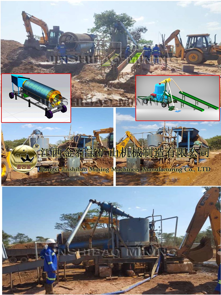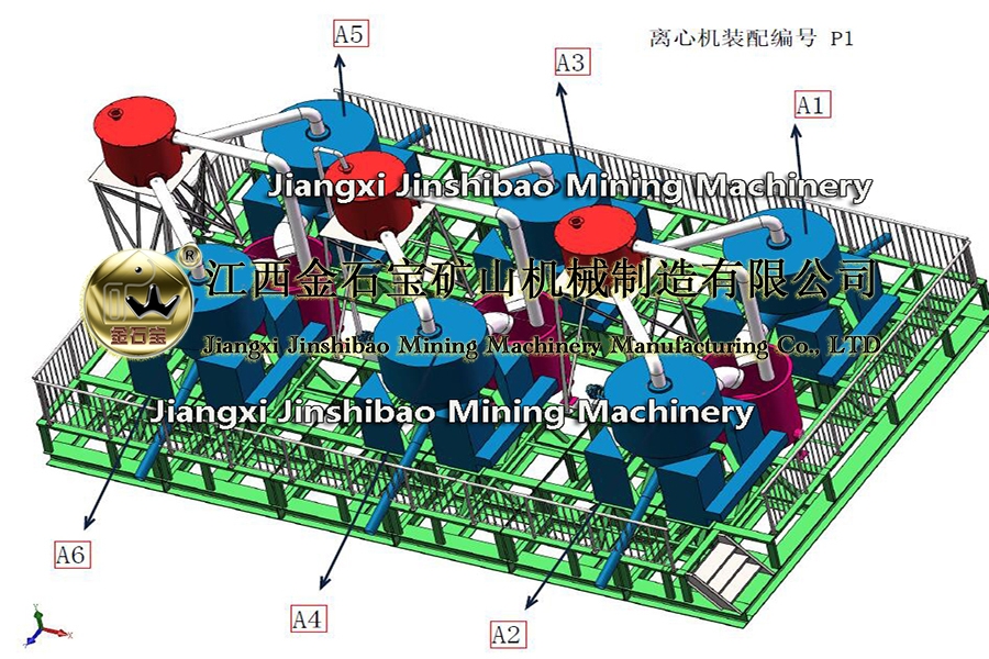 淘金流程为:圆筒筛-离心机-摇床-熔金炉, 水循环使用