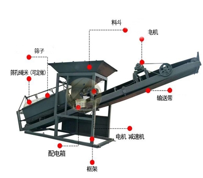 滚筒筛沙机主要由滚筒、机架、料斗、减速器、电动机、输送带等组成是仿照人工利用斜面筛网筛砂的工作原理石料经料斗进入滚筒后,一方面随着滚筒转动而被筛选,一方面粒度大的石料沿着滚筒的斜度向前流动,通过不同网目的的筛网逐渐被筛出。